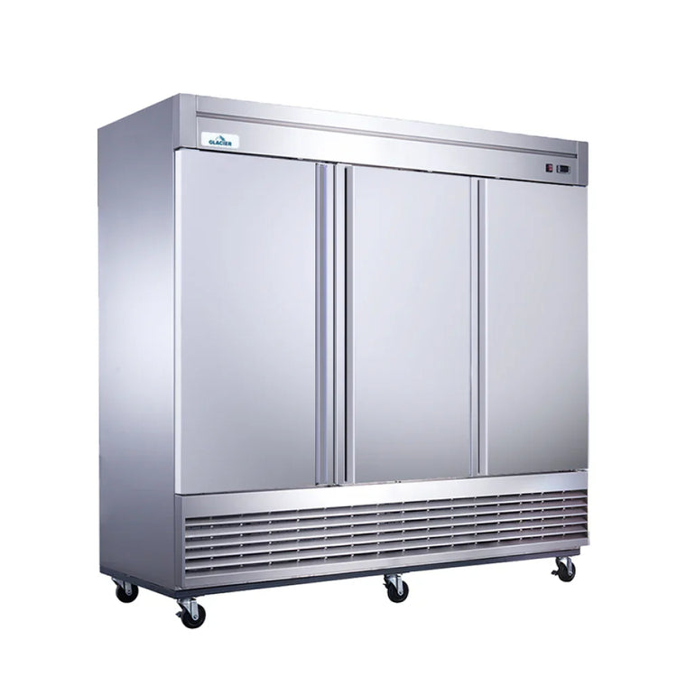 The Glacier GF-3 82" Bottom Mount Solid 3-Door Reach-In Freezer is an excellent choice for any commercial kitchen or food storage facility, offering both substantial storage space and a sleek, modern design that enhances your kitchen's appearance. Crafted with premium materials, this freezer ensures durability and reliability, making it a smart investment for your business.