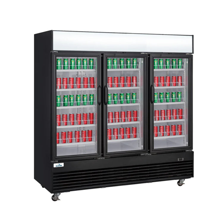 Upgrade to the Glacier GM-69R 78" Triple Hinge Doors Merchandiser Refrigerator for a top-performing refrigeration solution. Its stylish design, spacious interior, energy efficiency, and convenient features make it an excellent choice for any commercial establishment. This refrigerator not only meets but exceeds expectations, ensuring your products are kept at their best.