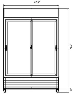 The KKool-It Refrigerated Merchandiser, 31 cu. ft., 47.5"W x 30.7"D x 75"H, (2) sliding locking glass doors, 33° to 40°F temperature range, digital thermostat with LED display, white baked enamel interior with (8) adjustable shelves, interior LED lighting, black powder coated steel exterior, bottom mount self-contained refrigeration, R290 refrigerant, (4) casters (2) locking, 1/4 HP, 115v/60/1-ph 3.3 amps, cord with NEMA 5-15P, cETLus, ETL-Sanitation