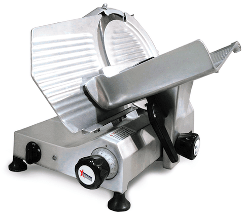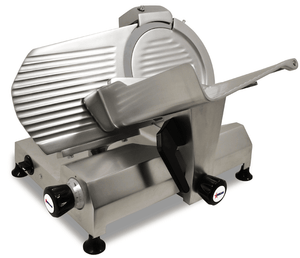 Omcan has a number of manual meat slicers with a 12" blade: they have light, medium, and heavy duty models available. Some are gear driven, some are belt driven. Some are part of their Economy meat slicers (which were made in China); others are their "Elite" series (which were made in Italy).