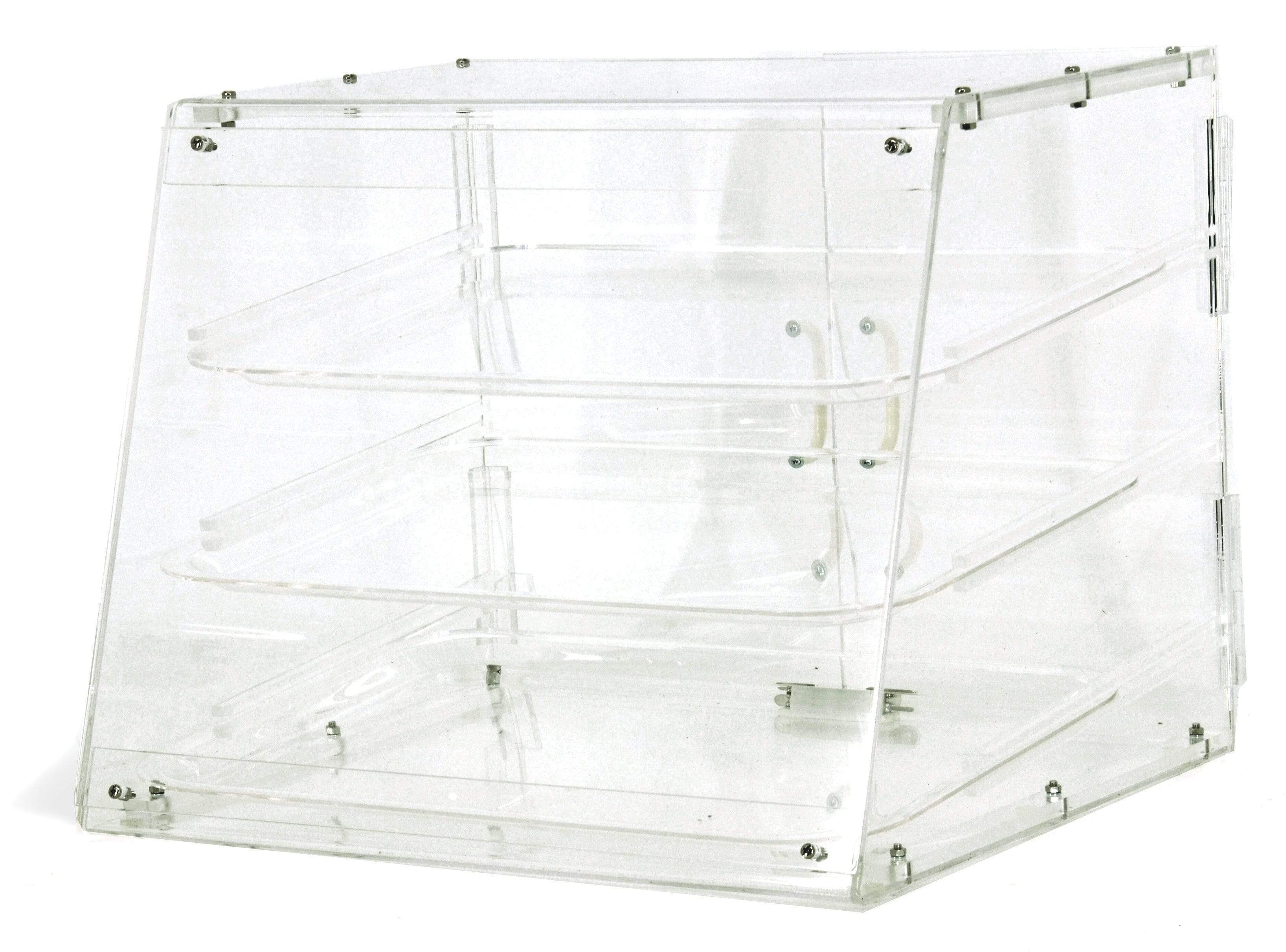 This is a sturdy, acrylic display case that is perfect for bakeries, cafes, concession stands, and more. It is 20.75" wide, 16.5" high, and 17.25" deep. It has rear doors with magnetic-latches, three removable trays, and white handles.