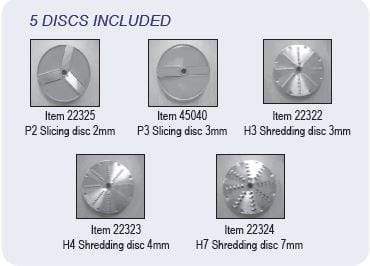 The Omcan FP-CN-0185 is a continuous feed vegetable cutter that is easy to use for all types of fruits and vegetables. It has a 0.75 horsepower motor with a single-speed of 270 RPM, and it includes 5 discs (2 slicing and 3 shredding).