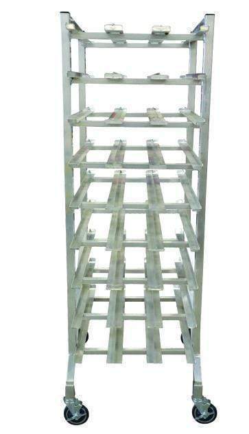 This Omcan is a full size aluminum can rack that has been welded for durability. It has 9 layers (with 27 rows) of can storage, so it'll be able to hold 162 #10 cans or 216 #5 cans.