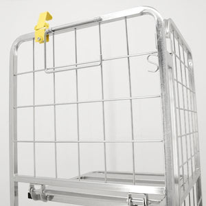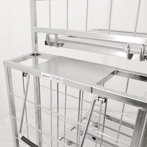 The Omcan Galvanized stocking cart has a capacity of 661 pounds (i.e., 300 kilograms). It's been constructed to have a hook, pull handle, paper towel holder, and cardboard holder easily accesible.