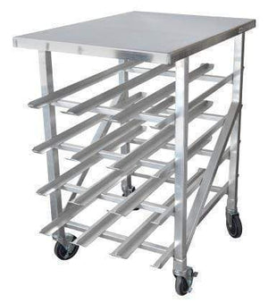 This Omcan can rack is half size and has been made with aluminum, so it also has a flat aluminum "table" surface on top. It's been welded for durability and has 4 layers (with 12 rows) of can storage, so it'll be able to hold 72 #10 cans or 96 #5 cans.