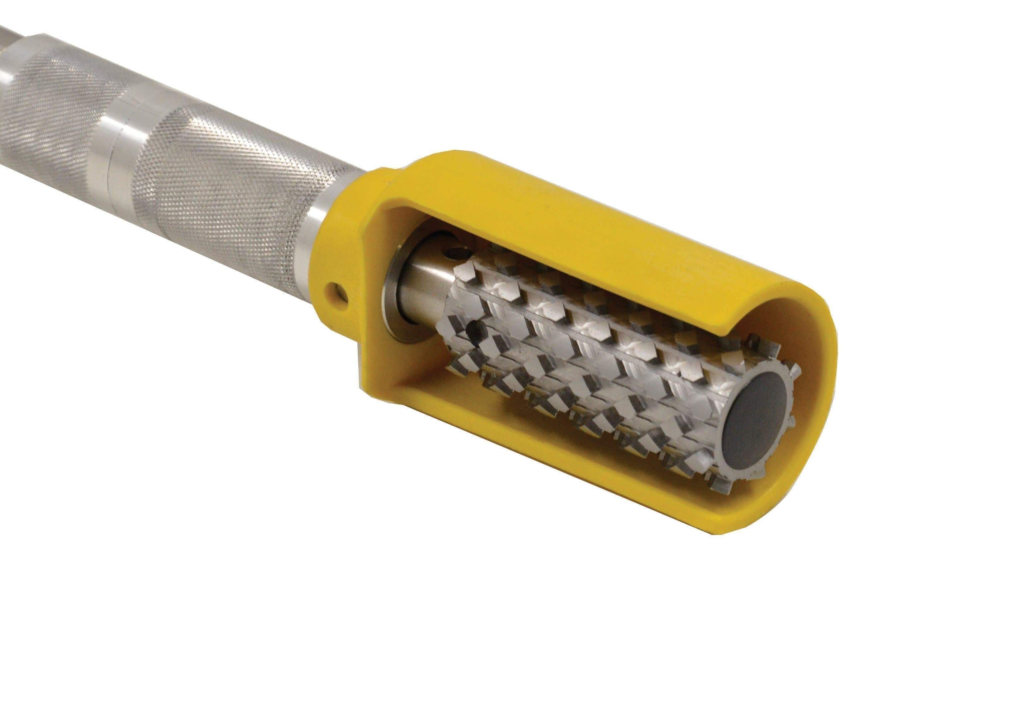 - Features a heavy-duty sealed motor, 5” flexible steel, reinforced drive shaft with anti-slip finish, and corrosion resistant, well guarded scaling head.