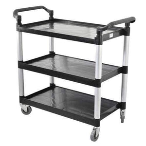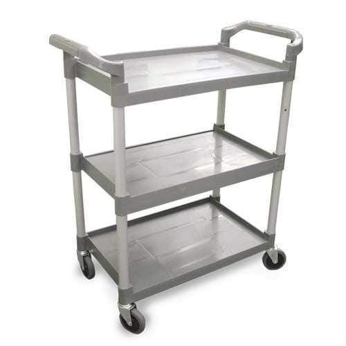 Each bussing cart has been made of a durable plastic that can withstand heavy usage in any restaurant or foodservice establishment. They have three shelves and four swivel casters (two of which have locks).