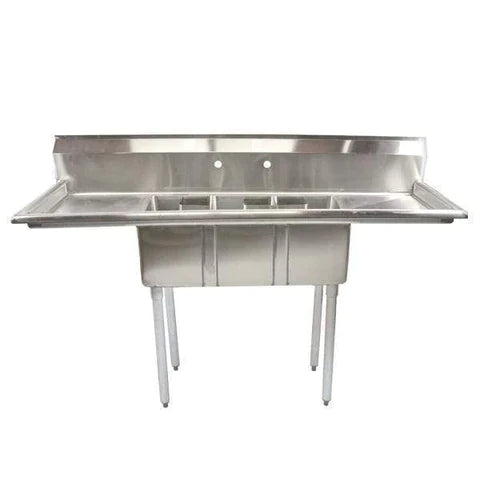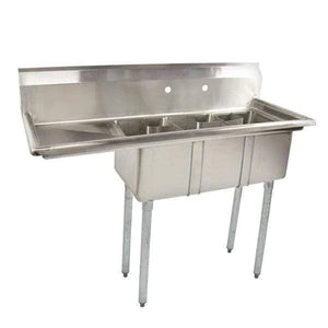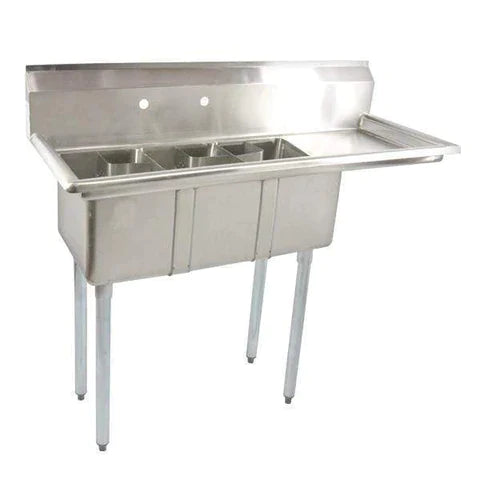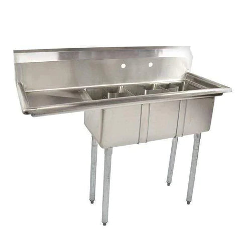 The Omcan space saver sink has three compartments that are 10" x 14" x 10" (that is, 10" left to right, 14" front to back, and 10" top to bottom). You can purchase the sink with or without drainboards, depending on your needs. It also comes with a centre drain.