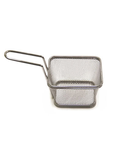 For a unique product presentation, serve a variety of fried foods, side dishes, appetizers, or entrees in this distinctive 4" square stainless steel fry basket. Each basket looks exactly like their kitchen counterparts, but at a fraction of the size. They are perfect for contemporary or themed restaurants, bars, or delis.